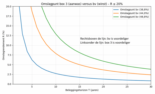 Bij invoering van de wet werkelijk rendement box 3 kan het lonen om te kiezen voor beleggen binnen de bv, maar alleen voor onbeclaimd vermogen en alleen als het verwacht rendement en de beleggingshorizon groot genoeg zijn. Dan weegt het voordeel van belastinguitstel in de bv zwaarder dan het voordeel van een lager tarief in box 3. Maar: hoe hoger het gecombineerde belastingtarief in de bv, hoe eerder box 3 toch de voordeligste optie blijft.