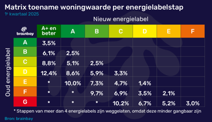 Ook onderzoeksbureau Brainbay constateert in een onderzoek uit mei 2025, dat een duurzamere woning een hogere waarde heeft. Elke stap naar een beter energielabel leidt tot een hogere gemiddelde woningwaarde. Zelfs kleine verbeteringen leveren al veel op. In onderstaande tabel ziet u hoe groot het effect van het verbeteren van het energielabel op de prijs is. Daaruit blijkt bijvoorbeeld dat een woning met label C gemiddeld 10,2% meer opbrengt dan een vergelijkbare woning met label G. Daarnaast blijkt uit cijfers van de NVM/Brainbay dat het prijsverschil tussen een roder en groener energielabel blijft stijgen. Tevens verkoopt een woning met een groener energielabel veel sneller en wordt ook vaker overboden.