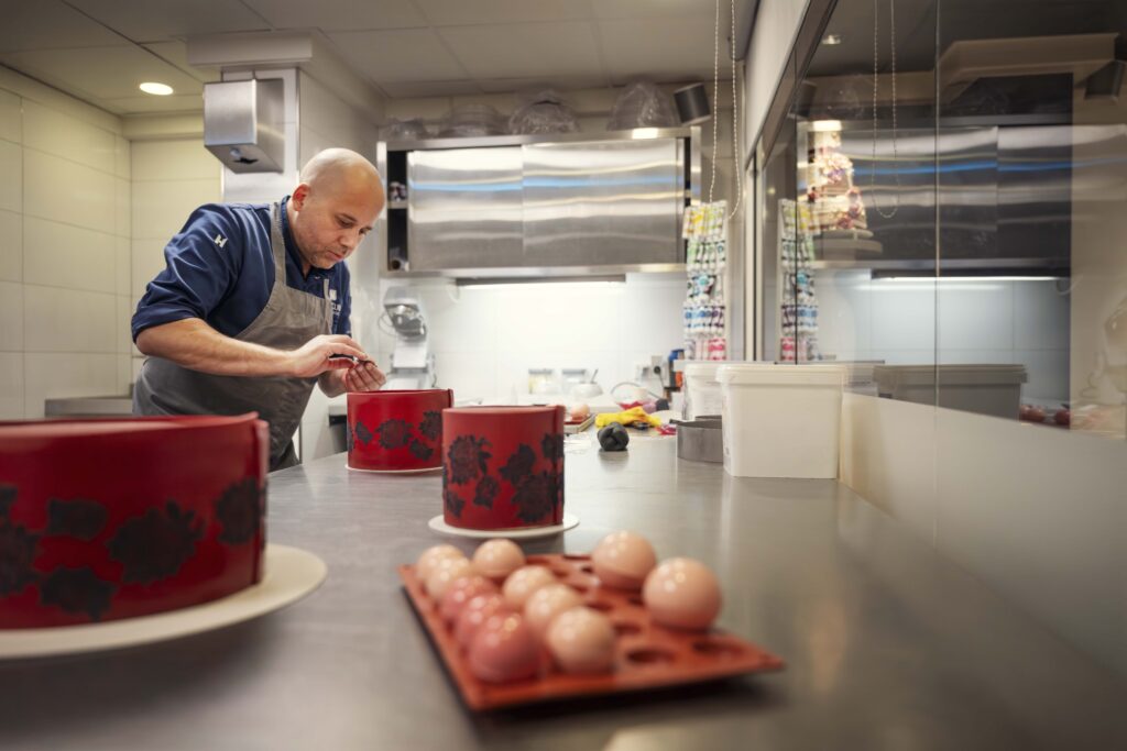 ‘De zaken gaan gelukkig erg goed. We werken ons met z’n drieën een slag in de rondte. In het najaar zijn we erg druk met de bestellingen voor de feestdagen. Voor particulieren desserts en taarten, voor bedrijven kerstgeschenken die ze aan hun medewerkers of klanten geven. Vanaf begin mei tot pakweg oktober trouwen veel mensen. Dan besteden we de meeste tijd aan de bruidstaarten. Daar kan ik veel creativiteit in kwijt. Het is een leuk proces: ik overleg eerst uitgebreid met het bruidspaar, niet alleen over kleur en smaak maar ook over de setting van de bruiloft. Alles moet kloppen, een bruidstaart moet echt een spektakelstuk zijn. Ik werk met de beste ingrediënten die ik kan vinden. Daar ga ik niet op beknibbelen. We werken met een relatief klein assortiment, zodat we de kwaliteit van onze patisserie kunnen waarborgen. Het is dan ook een mooie erkenning dat we al jaren de bruidstaarten voor het tv-programma Married at First Sight mogen maken. Erg leuk om te doen en het is goed voor onze merknaam, al mogen we als leverancier helaas niet meer op de aftiteling staan.’